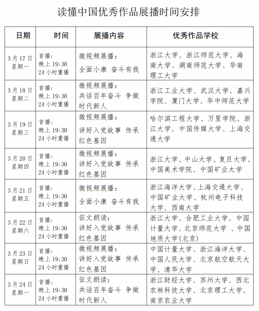 为深入学习贯彻习近平新时代中国特色社会主义思想,充分发挥“五老”精神在青年学生思想政治教育中的示范引领作用,根据浙江省教育厅关工委《关于开展“读懂中国”优秀作品线上展播活动的通知》要求,现组织全校师生收看“读懂中国”优秀作品线上展播。有关事项通知如下: