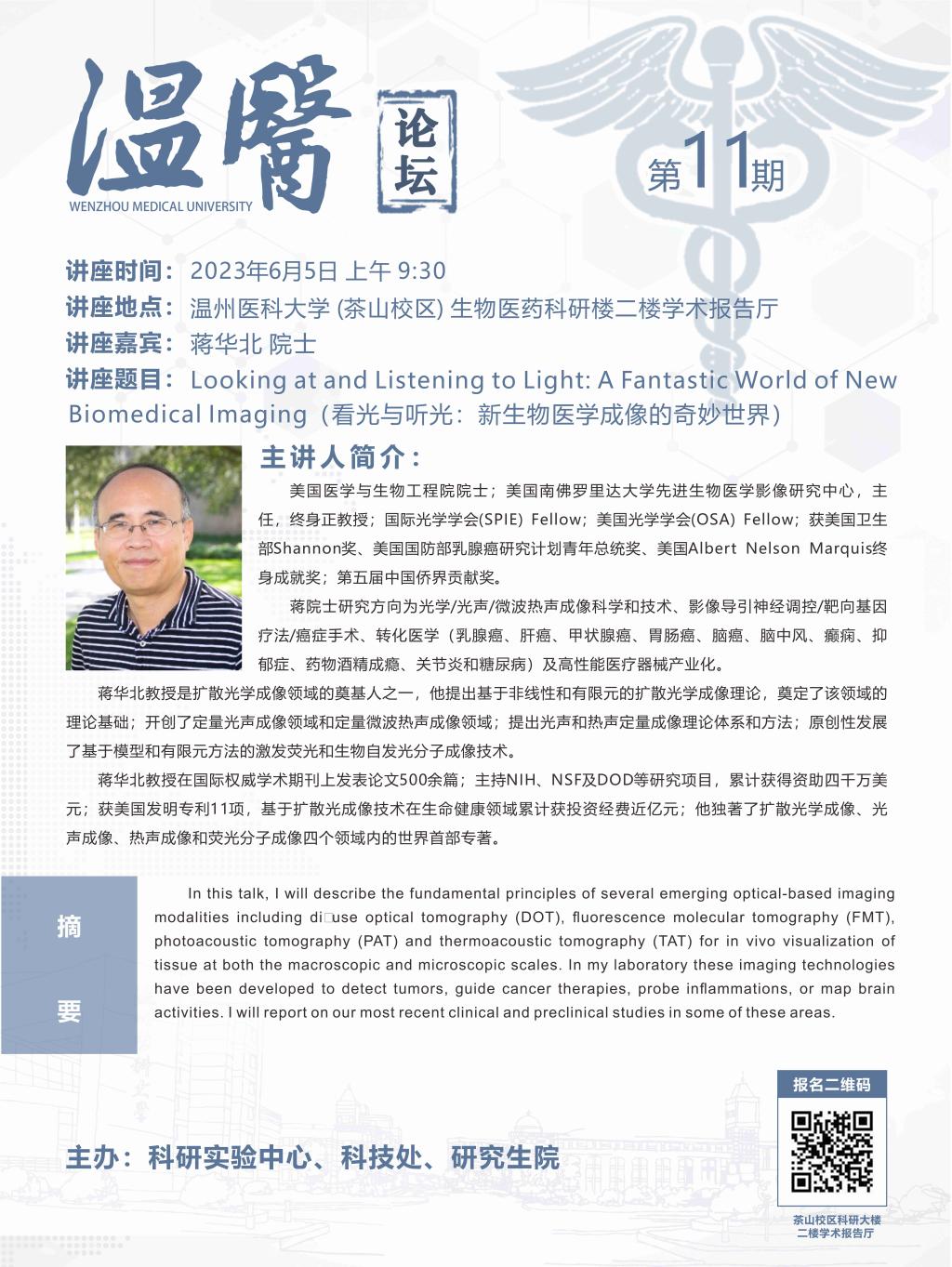 温医论坛第11期:Looking at and Listening to Light: A Fantastic World of New Biomedical Imaging(看光与听光:新生物医学成像的奇妙世界)