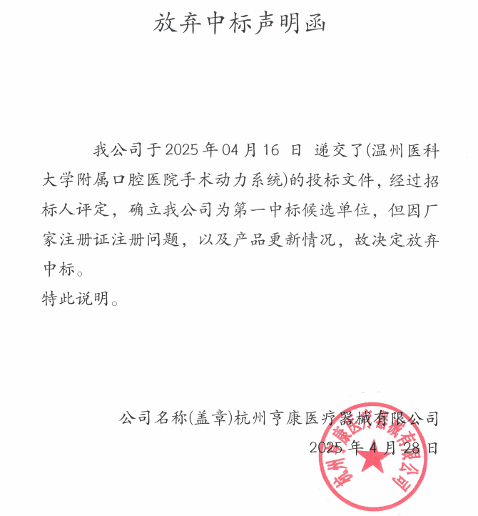 该项目收到杭州亨康医疗器械有限公司邮寄的放弃中标声明函。该项目评标报告只推荐杭州亨康医疗器械有限公司一家中标候选人,无法另行确定中标供应商。该项目将重新开展采购活动。